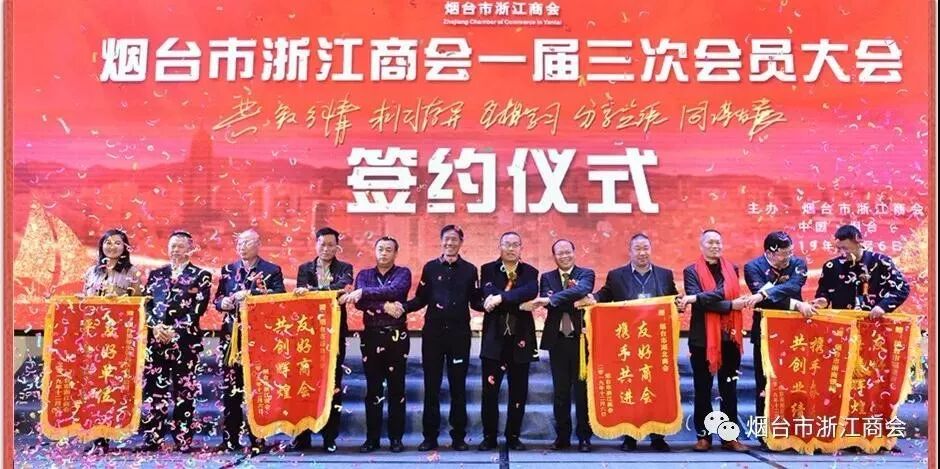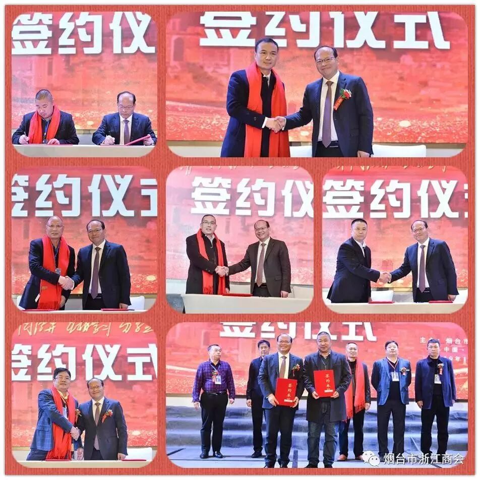 会议中,烟台市浙江商会与友好商会、友好合作单位签约及交换文本仪式。