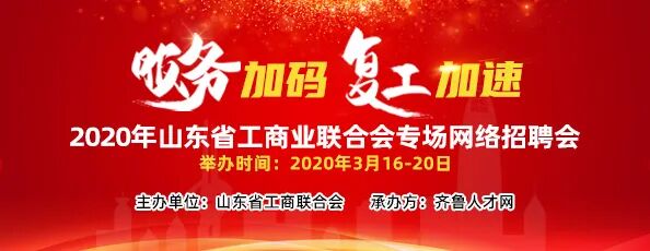 为全面贯彻落实党中央、国务院有关疫情防控期间就业工作的决策部署和省委、省政府有关工作安排,切实做好疫情防控期间公共就业服务,满足复工企业和求职人员需求。省工商联联合齐鲁人才网定于2020年3月16-20日,发起开展“服务‘加码’复工‘加速’”2020年山东省工商业联合会专场网络招聘会活动,精准对接企业所需人才,提高企业复工复产率,助力全省民营经济实现高质量发展。