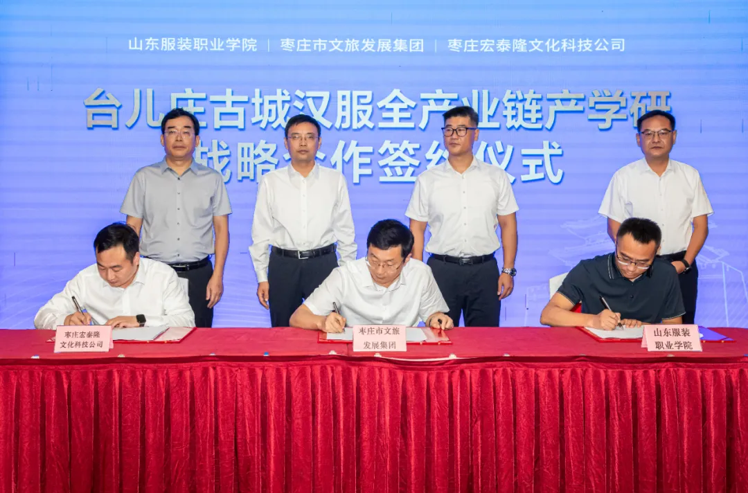 仪式上,山东服装职业学院党委委员、副院长陈健,枣庄市文旅发展集团党委副书记、总经理,台儿庄古城旅游集团党委书记、董事长张国伟;山东省浙江商会副会长、枣庄宏泰隆文化科技有限公司董事长周君来分别代表三方签署汉服全产业链产学研战略合作协议。